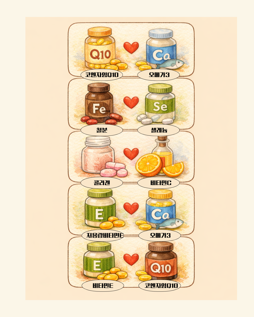 특히 철분+칼슘 분리, 코큐텐+오메가3 간격, 콜라겐+비타민C 조합은 꼭 기억해 주세요!