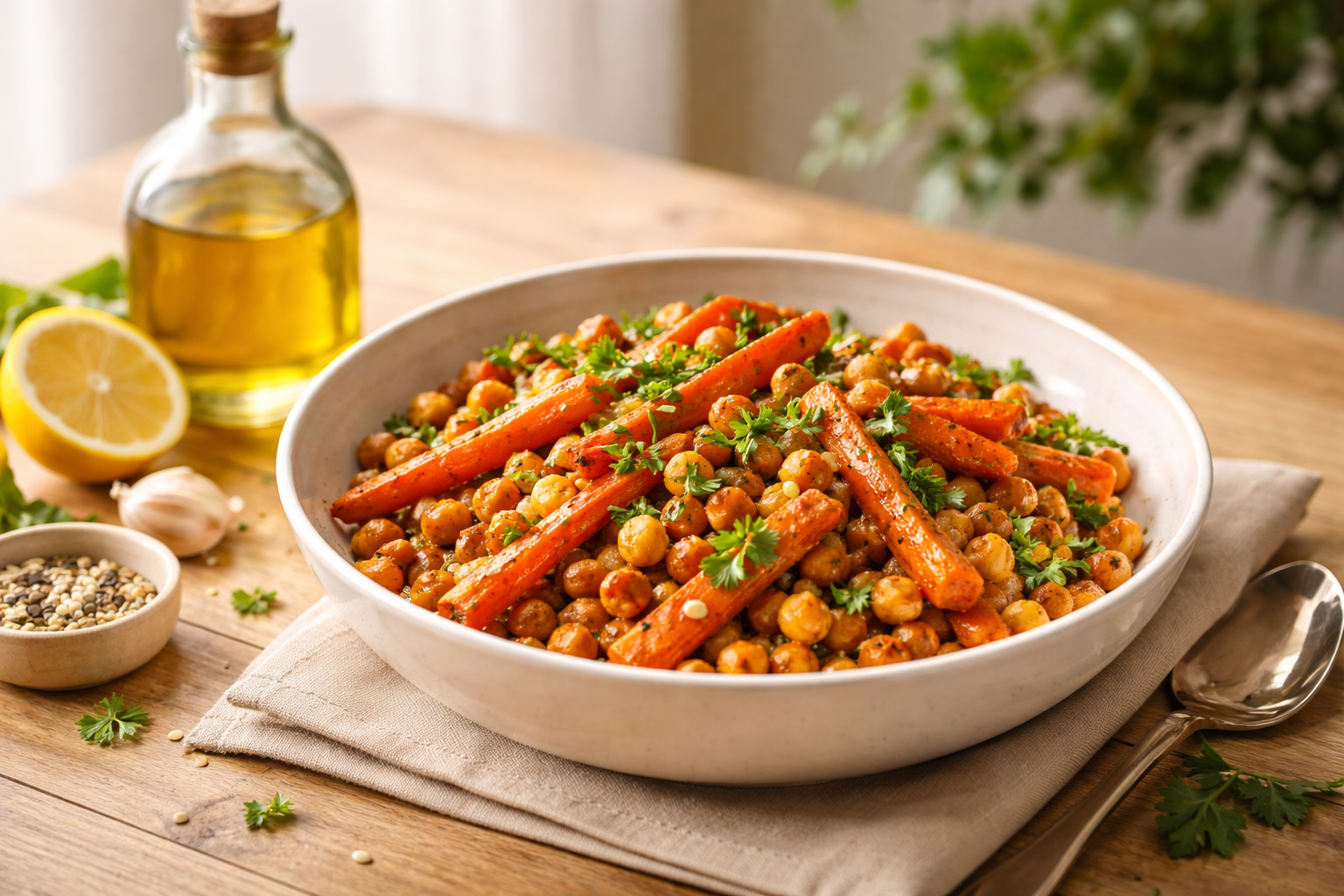 - 당근은 스틱 형태로 자르고, 병아리콩(통조림 또는 삶은 것)과 함께 올리브오일, 소금, 후추, 파프리카 가루를 뿌려 180도 오븐에서 25분간 굽습니다.